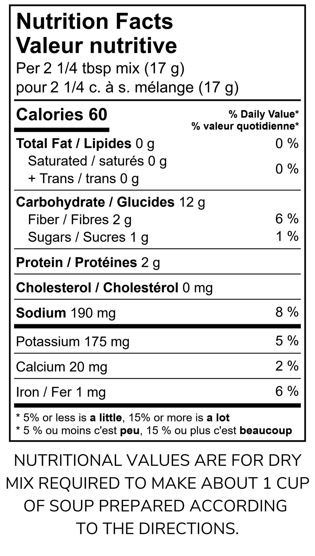 Ingredients: Haricots Great Northern, Orzo (semoule de blé dur), Base de soupe (extrait sec de sirop de maïs, sel, sucre, farine de blé, dextrose, amidon de maïs, huile de canola, gomme de guar, épices, persil, curcuma, arôme naturel), Pomme de terre séchée, Tomate séchée, Ail, Oignon, Fines herbes, Épices.
