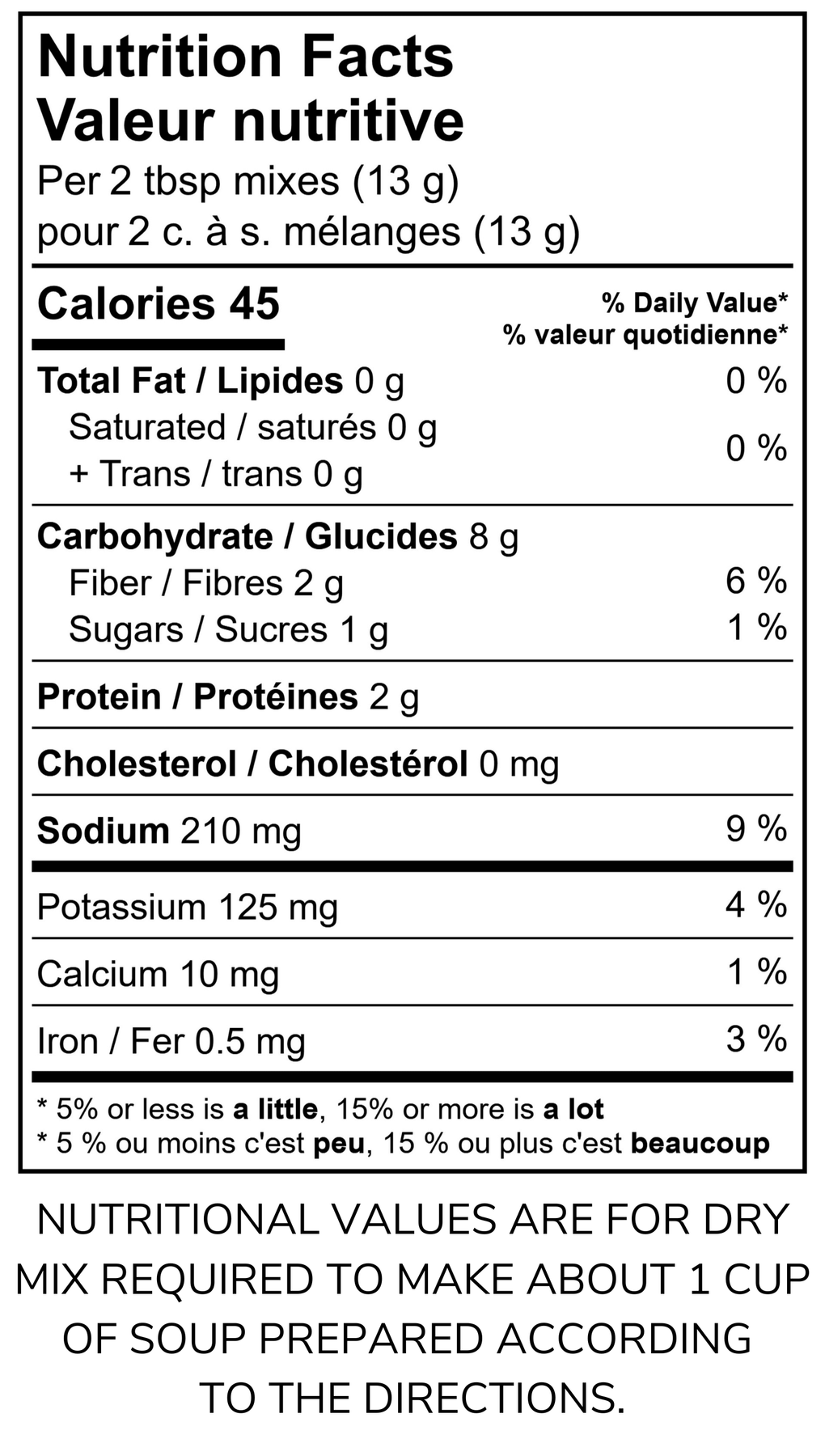 Ingrédients : Haricots pinto, Pois cassés, Base de soupe (sel, extrait sec de sirop de maïs, dextrose, farine de blé, sucre, huile de canola, amidon de maïs, poudre d’oignon, extrait de bœuf, gomme de guar, épices, fines herbes, guanylate disodique, inosinate disodique, arômes naturels, curcuma, caramel), Poivron séché, Maïs séché, Pois séchés, Ail, Oignon, Fines herbes, Épices (moutarde). Peut contenir : Autres noix, Arachides, Soya, Œufs, Sésame, Lait, Orge, Avoine, Sulfites.